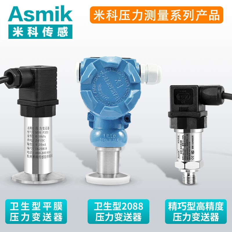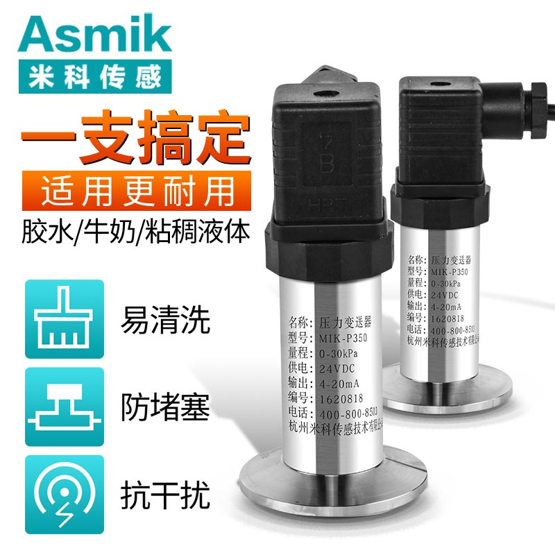 MIK-P350系列平面膜結構壓力變送器選用德國進口擴散硅芯體,采用平面膜直接感受壓力。傳感器接口有卡箍式,M27×2,法蘭式可供選擇。輸出信號有電壓、電流、頻率信號等可選擇,傳感器平膜片防止了結垢,不衛生及粘稠液體堵塞等問題。廣泛應用于食品、醫藥、衛生及釀酒工業等部門。