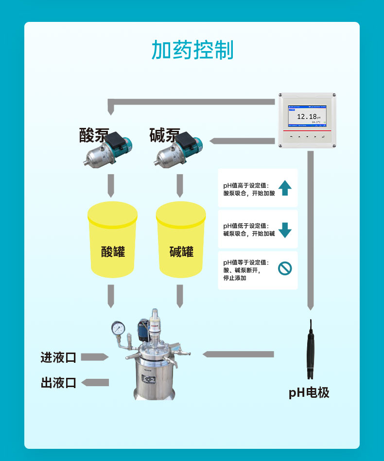 酸堿(pH)調節是為滿足工藝流程的需要,在電鍍工藝中電鍍液的pH控制、冶金浮選工藝的礦漿pH控制、化工流程中流程介質母液的pH控制等。在水處理工藝中,被處理水的pH值會影響各種藥劑的使用效果,不同種類的廢水在完成各種處理后也可能不在允許排放的pH范圍內。