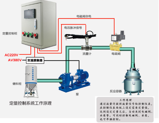 米科定量控制系統(tǒng)是由流量計、流量積算儀、電磁閥和定量控制箱等裝置組成。可實現(xiàn)對流體的定量計量、定量灌裝、定量配料等過程的控制。結(jié)構(gòu)如圖所示。