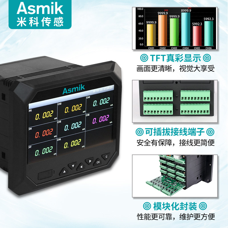 米科MIK-R6000F無紙記錄儀是將工業現場的各種需要監視記錄的輸入信號,比如熱電阻和熱電偶的溫度信號、流量計的流量信號、壓力變送器的壓力信號等。通過高性能微處理器進行數據處理,一方面在高分辨液晶顯示屏幕上以多種形式的畫面顯示出來,另一方面把這些監察信號的數據存放在儀表內部的大容量存儲芯片內,以便在儀表上直接進行數據和圖形查詢、翻閱和打印。