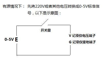 第三種方法:開關量是不帶電壓的情況下,那么可以和第一種方法一樣,用0-5V或者0-10V開關電源來充當電源,接線上將開關量信號串到回路中,和記錄儀對應的端子連接就可以。儀表組態的設置成對應的信號輸入,比如0-5V,量程設置成0-1V,那么0代表斷開,1代表閉合。